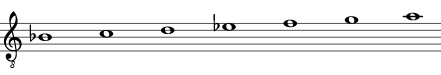 C’est la gamme de do majeur. Il y en a 12 en tout. Prenons-en une autre au hasard, si♭ majeur. Comment trouve-t-on la gamme ? En solfège on apprend qu’à la clef on aurait 2 bémols, donc on ré-écrit de si à la, avec des bémols pour si et mi. Mais pas le peine de connaître toutes ces règles. Il suffit de repartir de définition de la gamme majeur. Donc si♭ et un ton, c’est do (si♭-si+ si-do), puis un ton, ré. Un demi-ton : mi♭. Puis ton trois fois : fa sol la. Et le demi-ton final, la-si♭. Et voilà ! Je retrouve bien mes deux bémols. Et donc :